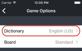 To change the dictionary, tap the "Dictionary" button in the "Game Options" screen.