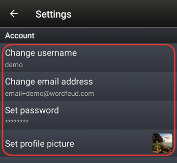 You can easily change your username, email, avatar and password. To do so, first navigate to the Settings screen by tapping menu button and choose Settings.