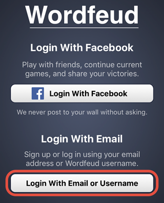 1) Launch Wordfeud, then tap Login With Email or Username.