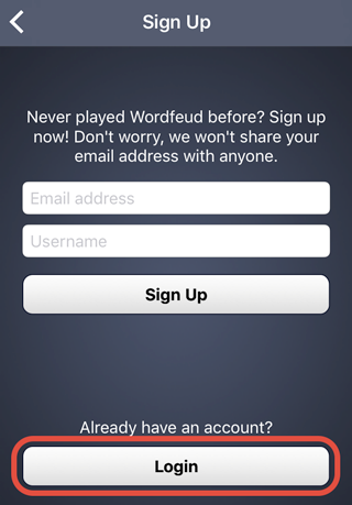 If you've reinstalled Wordfeud, for example after getting a new phone, you can easily login to your existing Wordfeud account.